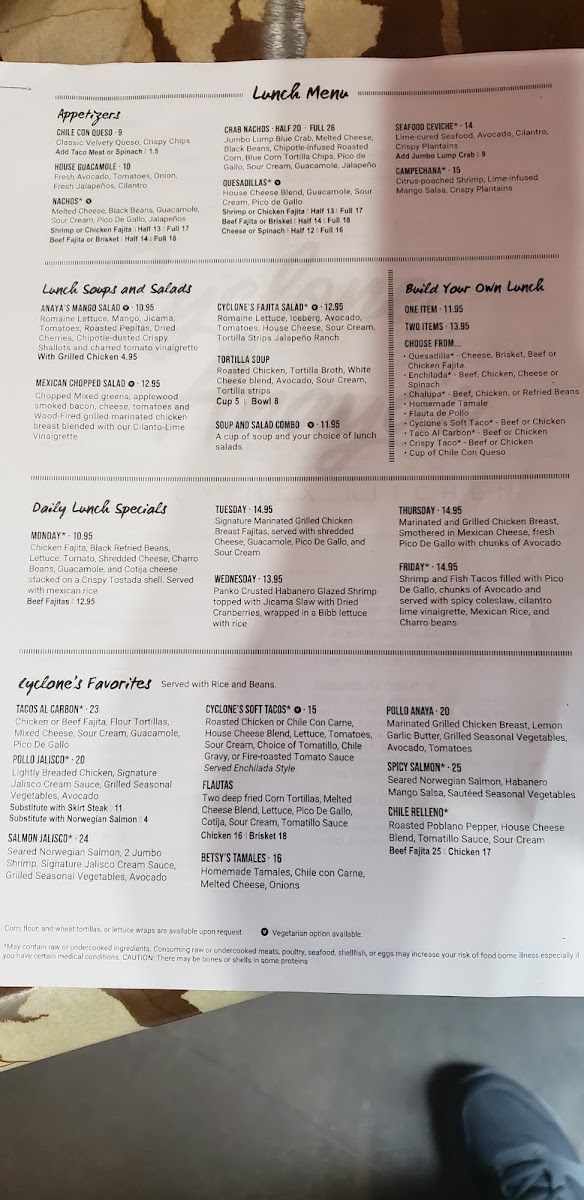 Welcome to Cyclone Anaya’s, a vibrant Tex-Mex kitchen located in Rice Village, Houston. This lively eatery invites guests to indulge in bold flavors, highlighted by a menu that features delectable dishes like the Beef Enchilada, made with lingering spices and a rich chili con carne. For seafood lovers, the Mariscos enchiladas offer a delightful fusion of shrimp and lump crab, skillfully paired with seasonal ingredients.